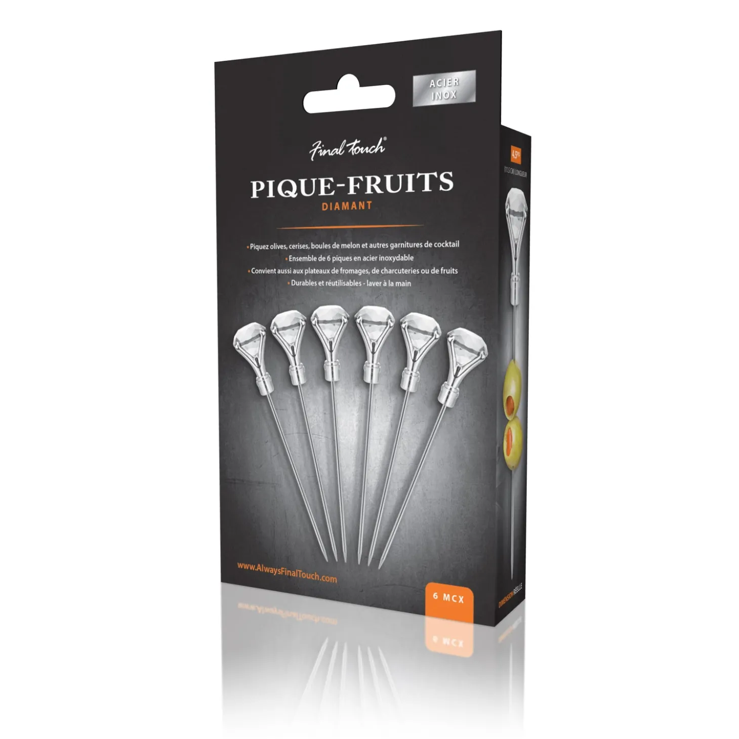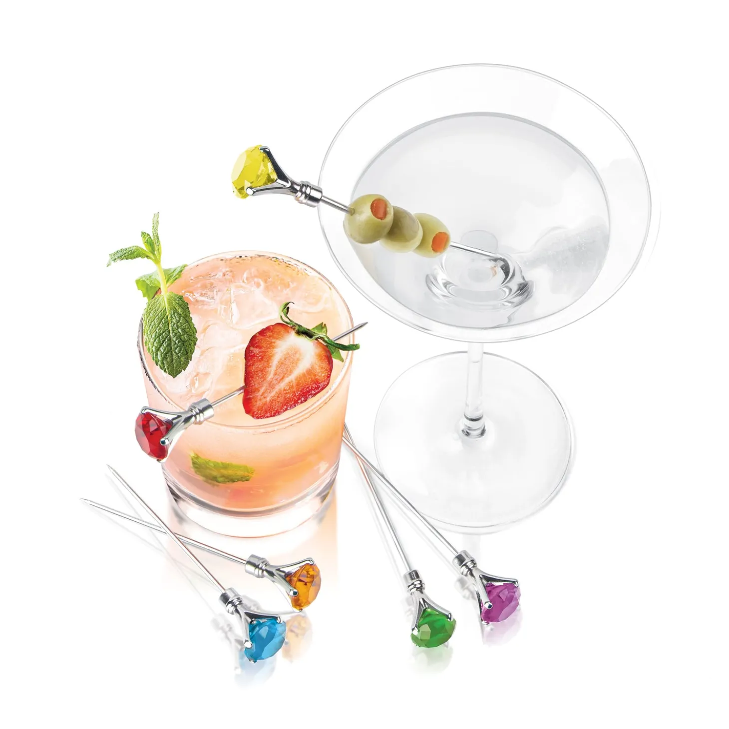 Use these simple yet elegant diamond cocktail picks to skewer garnishes like olives, cherries & melons. Includes 6 stainless steel picks that are reusable. Not only are these picks great for dressing up drinks, they can also be used for cheese, meat & fruit platters.