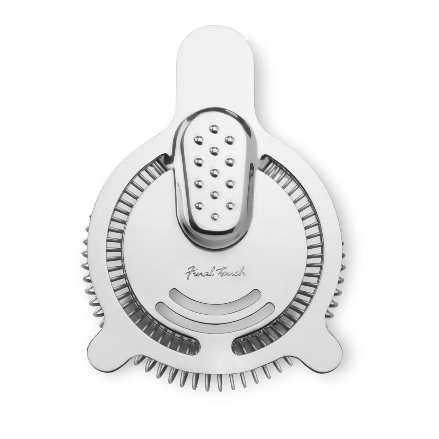 Raised lip focuses the pour towards the spout preventing spills & drips Finger rest improves grip Compact design for easy storage Removable metal spring catches ice Brushed 304 grade stainless steel “