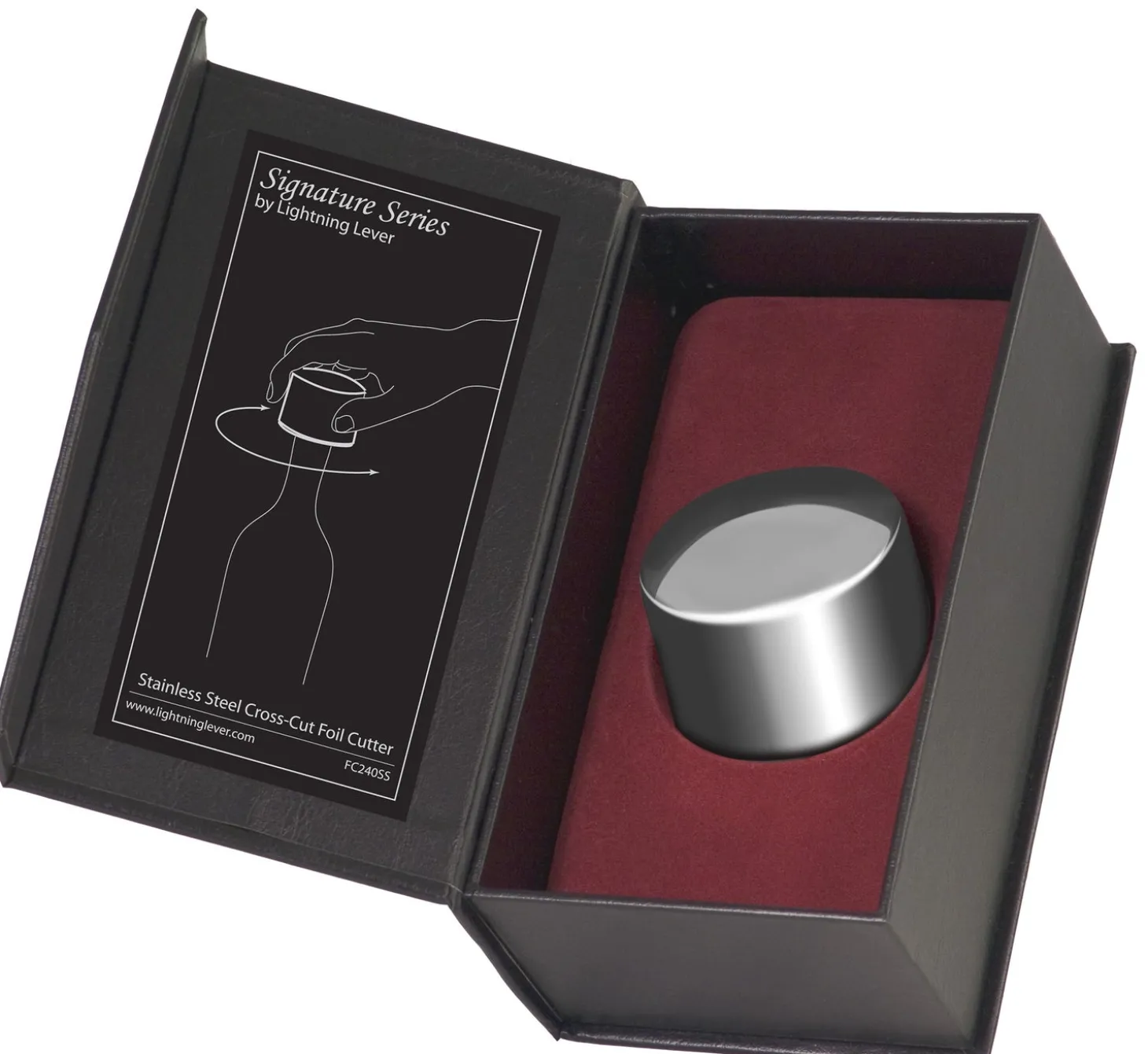 Remove foil from the bottle in seconds with this foil cutter. Simply place on the bottle, push down and the six hidden cutting blades remove the foil with ease. Includes elegant faux leather storage box.