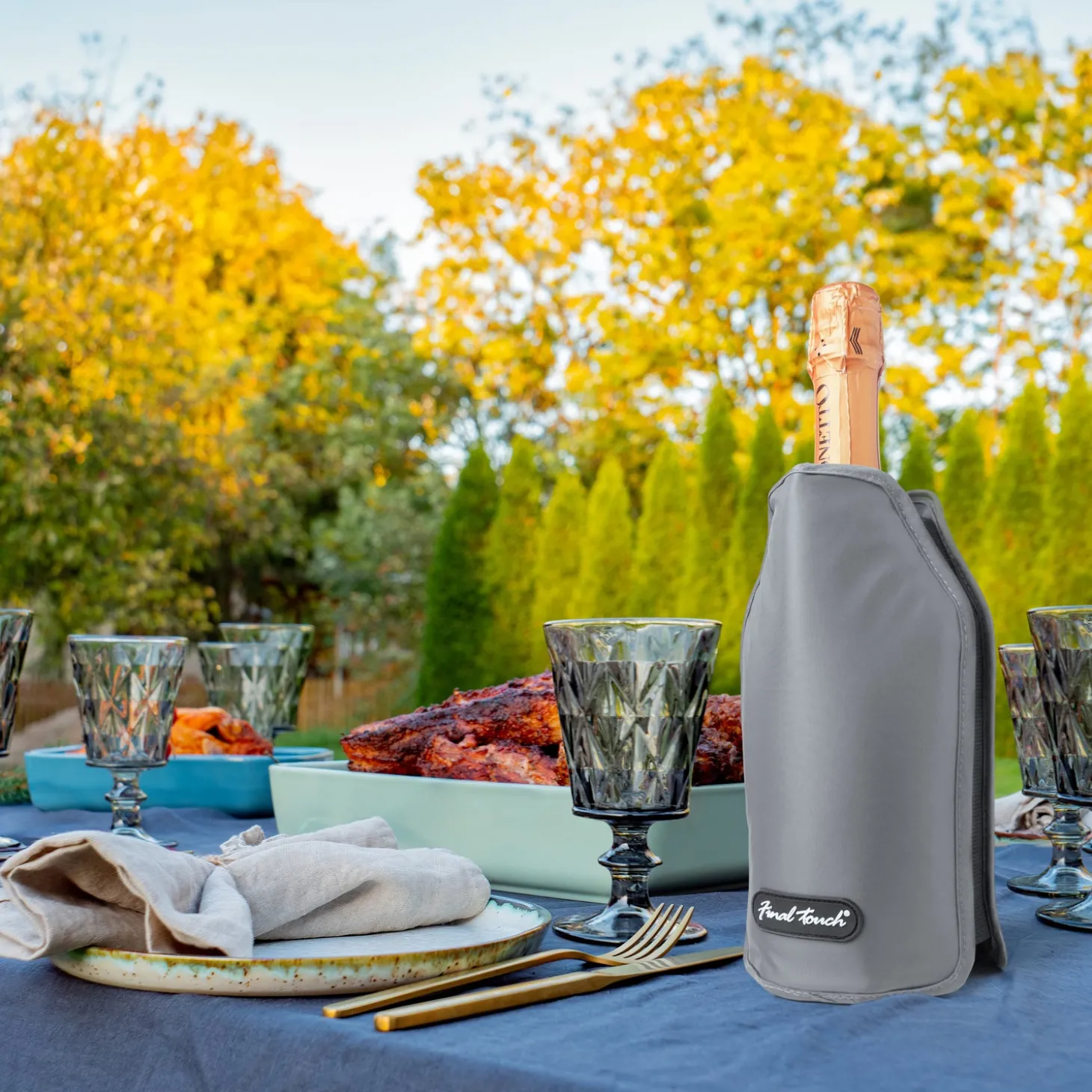 The Final Touch Bottle Cooling Sleeve keeps your bottles cold for up to 1 hour without messy drips from ice. Simply freeze and slide it over your bottle for a snug fit. The dual gel packs ensure an even, consistent chill with its solid gel pack design that does not sag. Perfect for wine, Champagne, liquor, sake, soda and more, it fits standard 750 ml bottles perfectly. Elevate your beverage experience now!