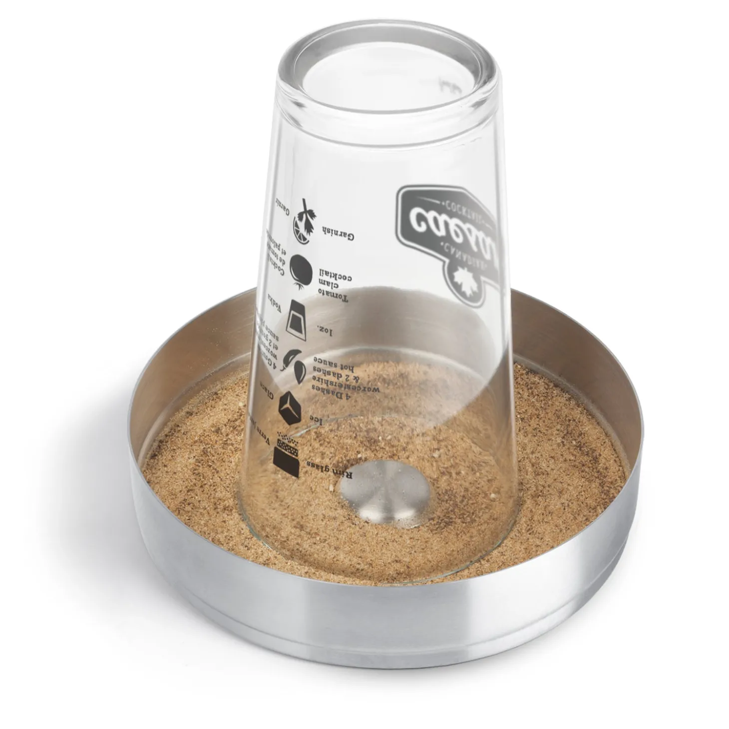 Serve up the ultimate Caesar with this all in one set. Easily rim each glass in the included rimming tray with lid that doubles as a lemon / lime juice tray. Then just add ice & ingredients to each of the 4 included glasses. Don’t know the recipe? No problem. Just follow the recipe printed directly on the back of each glass.Caesar Glasses