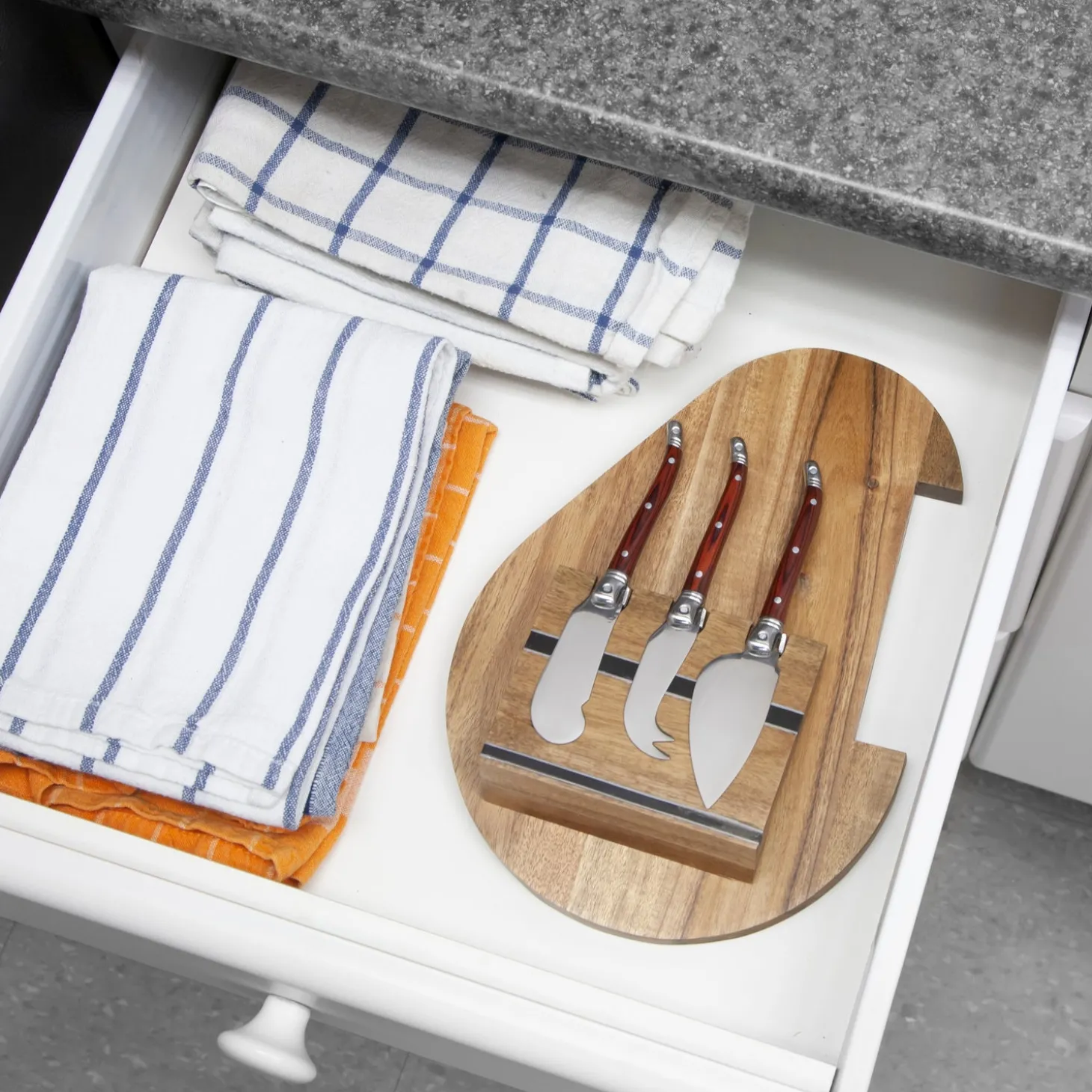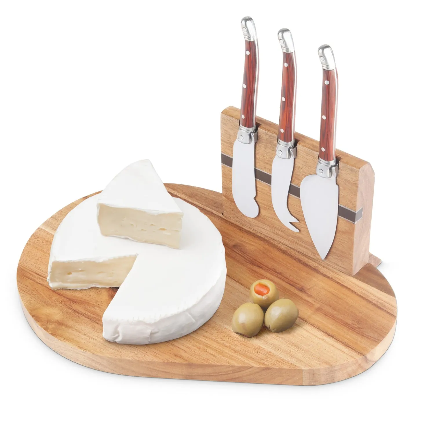 Slice & serve in style with this magnetic cheese board set. The removable magnetic cheese knife block helps keep the knives neatly organized and protected while in use or stored away in a drawer.