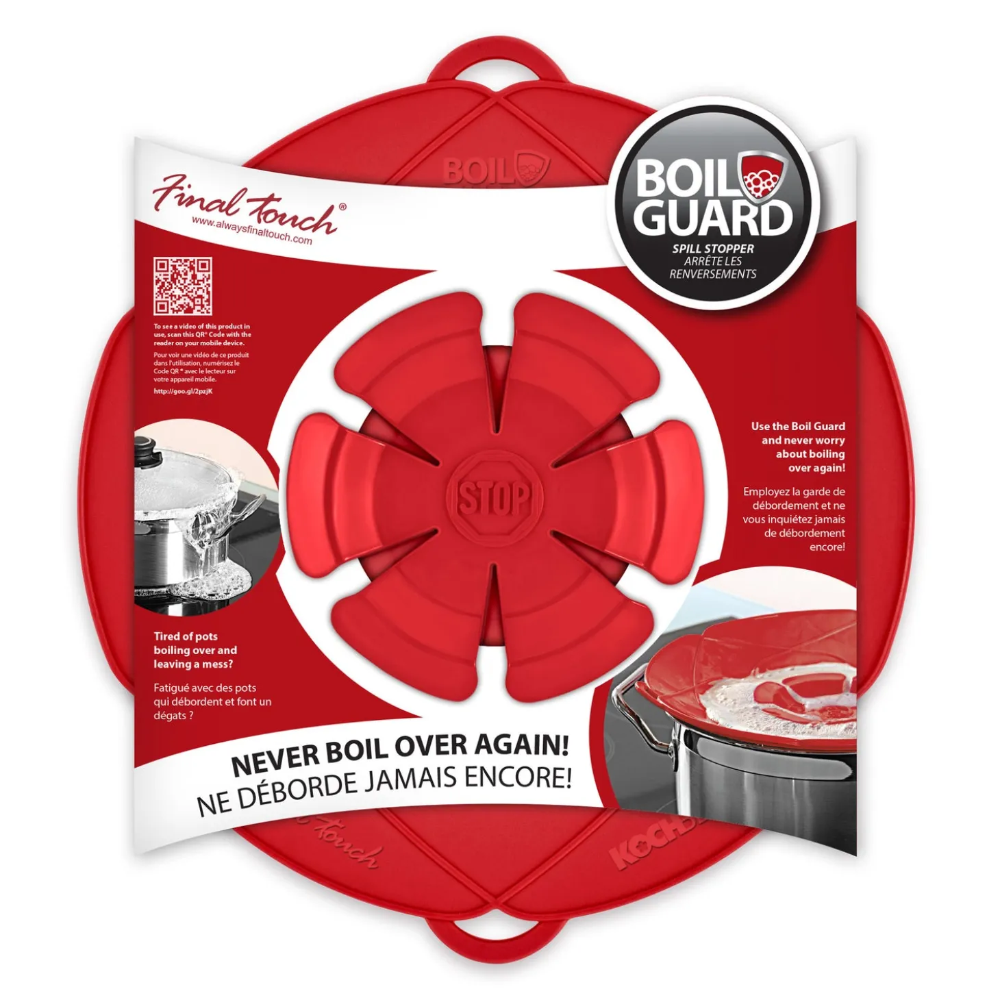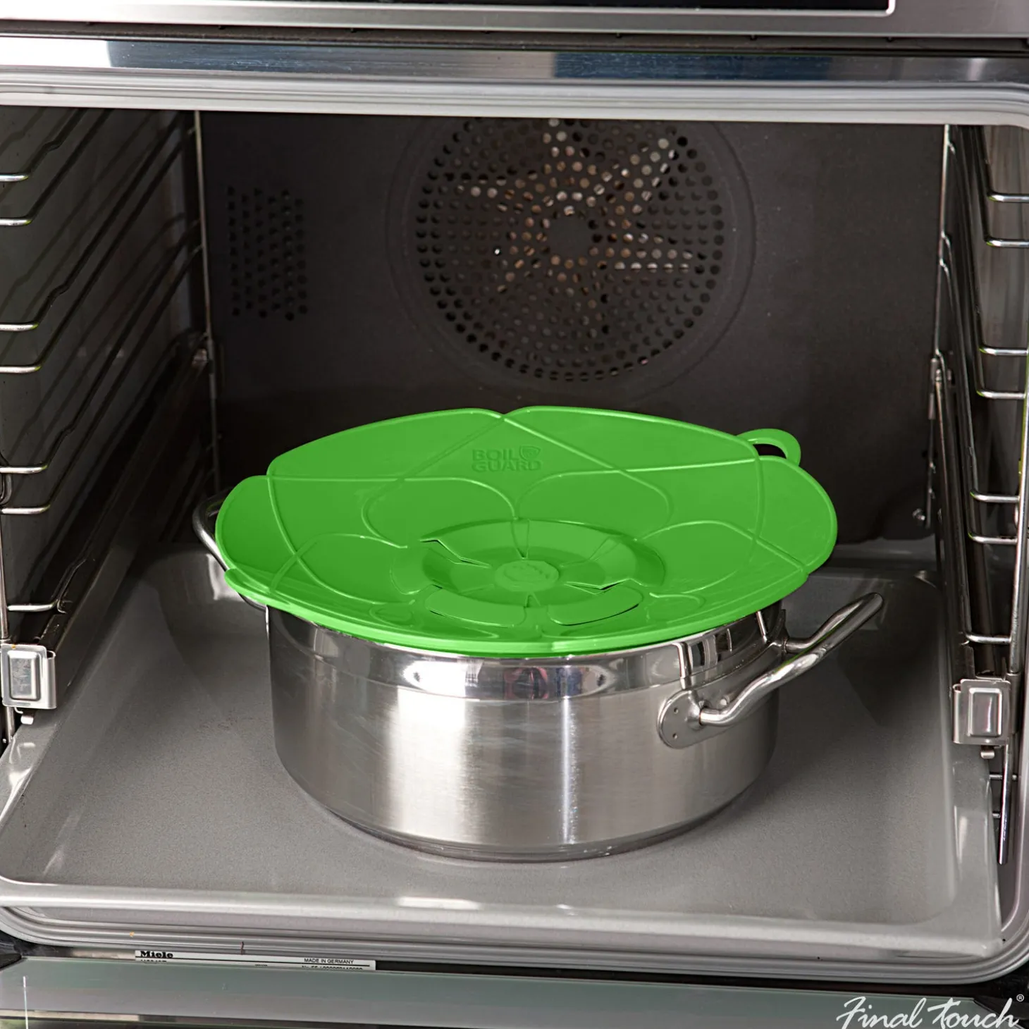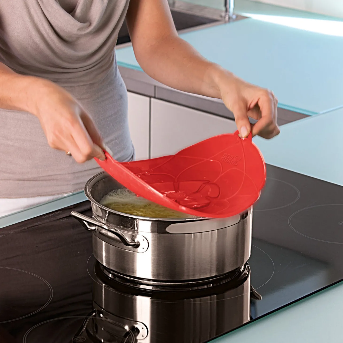 Simply place on the saucepan & it’s ready to use!It’s ingenious and it really works! Use with milk, pasta, rice and other food that is prone to boiling over. Thanks to the Boil Guard your stovetop will stay spotless – nothing will boil over again!Energy SaverThe centre piece will act as a vent and will allow steam to escape to prevent boiling over. This maximizes the internal cooking temperature, increasing energy efficiency vs. cooking without the lid.Microwave SafeUse as a splatter guard (right side up) or as a steamer lid (inverted).Heat resistant / Food-gradeMade of FDA approved food-grade silicone. BPA-free. Temperature resistant up to 230°C (446°F). Can also be used as a trivet.Dishwasher SafeEasy-to-clean, just place in the dishwasher.Great For SteamingEasily steam vegetables. Use as a double steamer with rice or other grains in the bottom.Oven & Stovetop SafeUse with or without the middle insert to prevent splatter in the oven or on the stovetop.