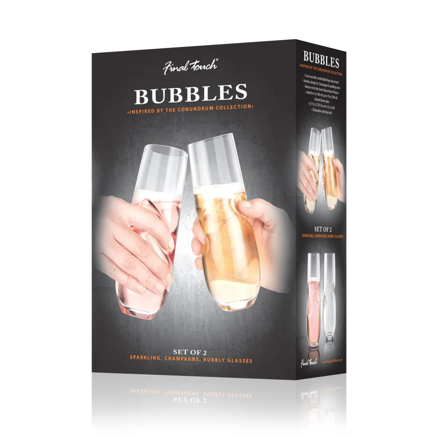 Mouthblown Bubbles Glasses are not your average stemless! Each glass is hand crafted with sleek curves making it comfortable to hold and a better sparkling wine bubbles experience.