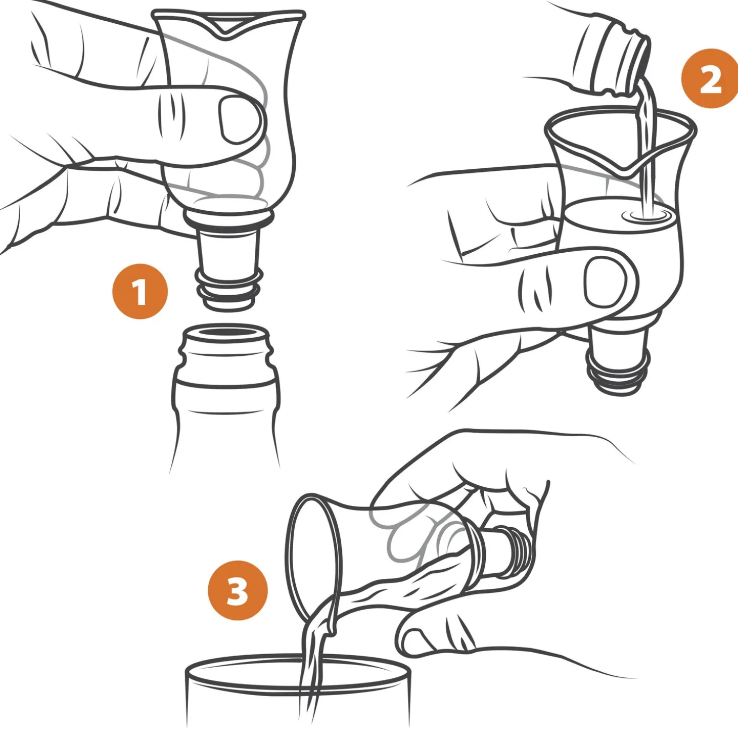 Remove . Measure . Pour Give each of the bottles in your bar a unique touch. With this 3-in-1 measuring jigger, bottle stopper & shot glass you can measure out the perfect shot quickly & easily in both ounces & milliliters. Simply remove the cap from the bottle and insert onto most liquor bottles. The built-in silicone and spout helps to prevent drips and leaks while pouring.
