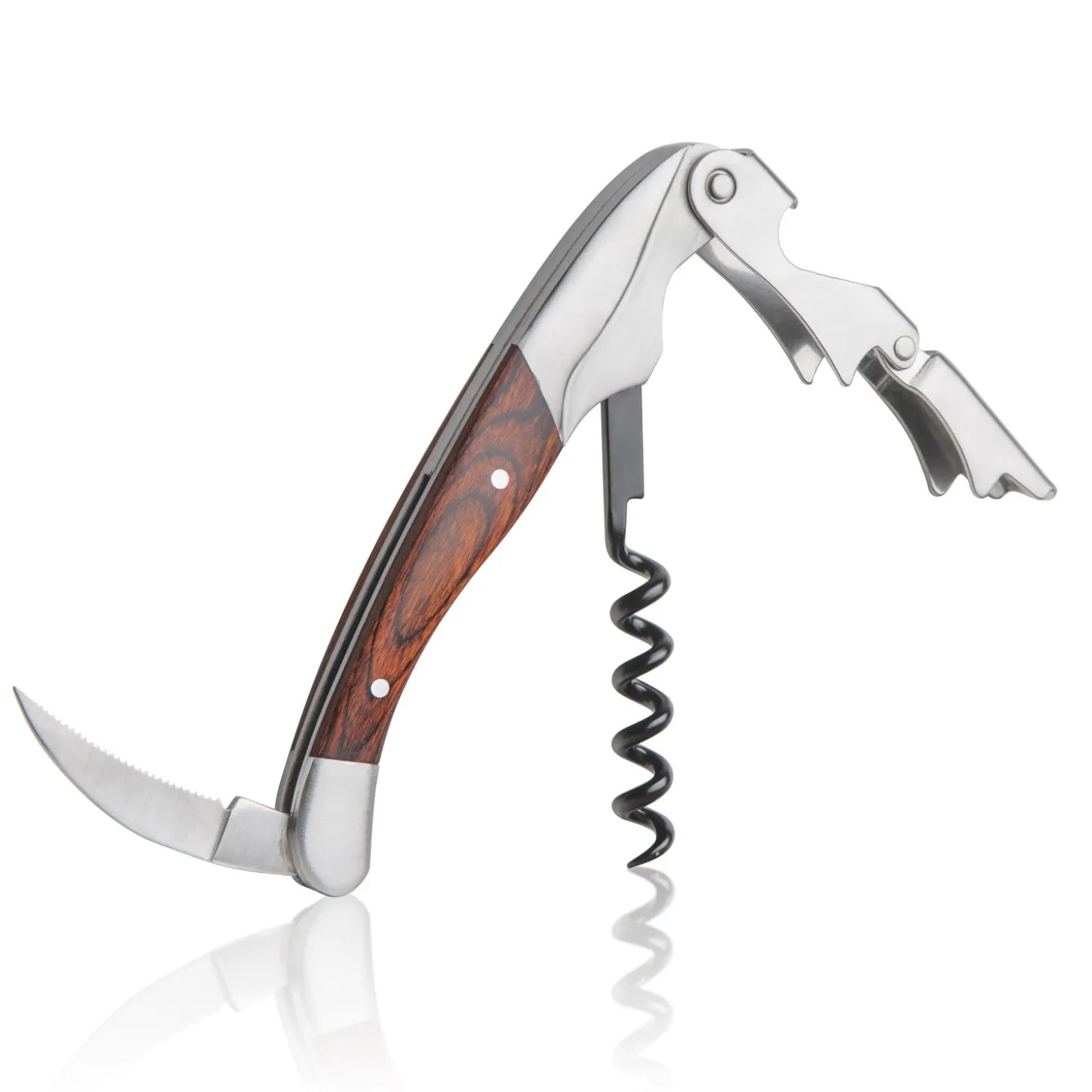 The compact design of this corkscrew is preferred by waiters & sommeliers. With the 2-step lever design, corks can be removed with minimal pulling effort. Also built-in is a serrated stainless steel foil cutter & bottle cap opener. Made from commercial grade 304 stainless steel with classy wood inlays.