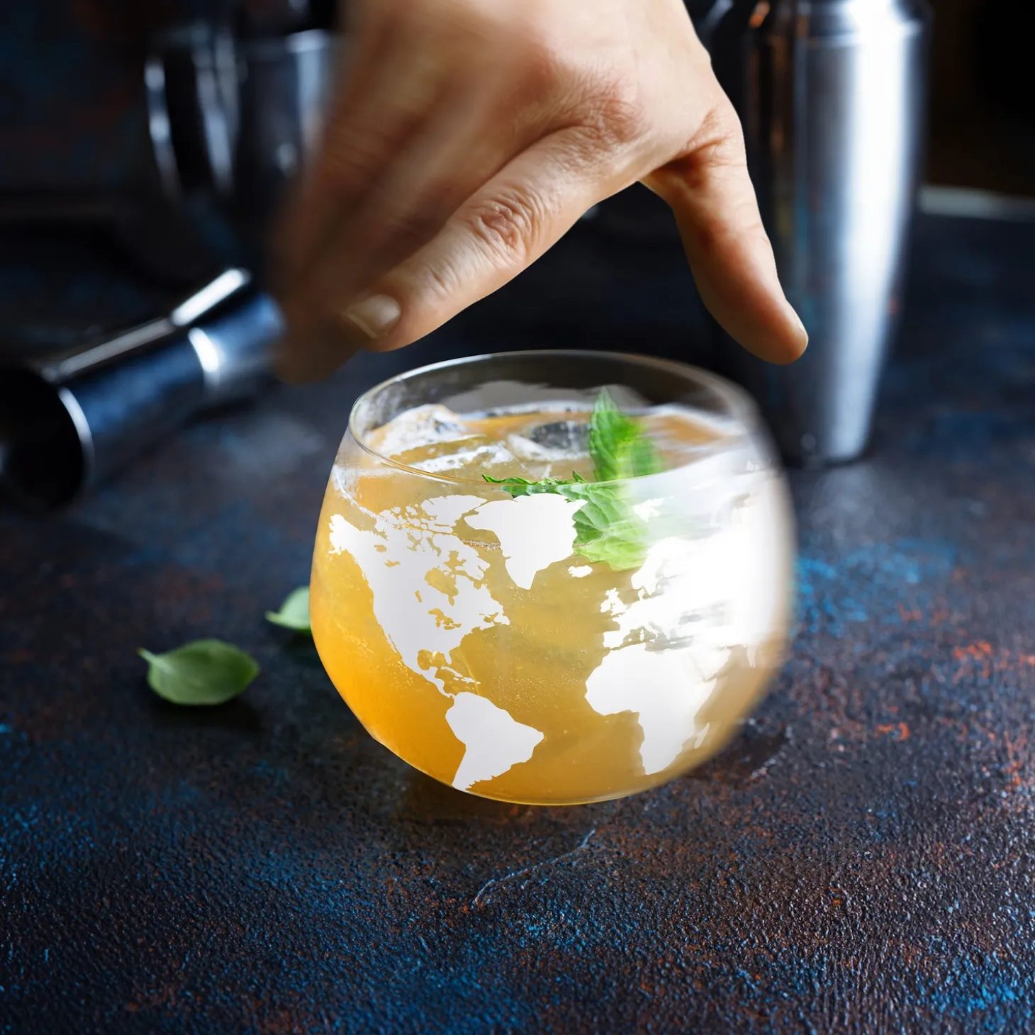 A mesmerizing addition to any beverage, this revolving globe glass steals the spotlight. Enhanced with a stylish world map decal, the glass revolves gracefully, offering a visual journey across continents. This innovative touch transforms the glass into a conversation, encouraging to explore global flavours with each elegant spin.