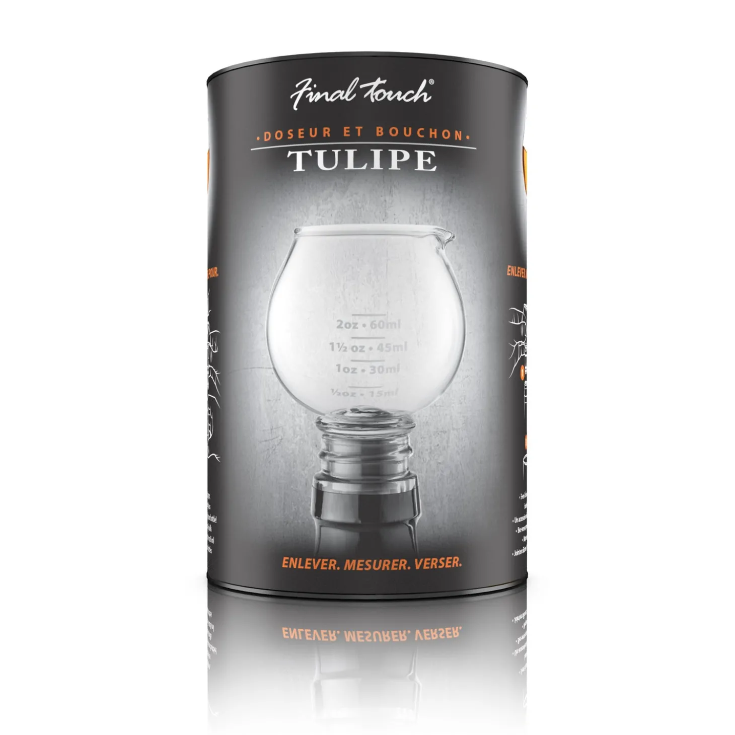 Remove . Measure . Pour Give each of the bottles in your bar a unique touch. With this 3-in-1 measuring jigger, bottle stopper & shot glass you can measure out the perfect shot quickly & easily in both ounces & milliliters. Simply remove the cap from the bottle and insert onto most liquor bottles. The built-in silicone and spout helps to prevent drips and leaks while pouring.
