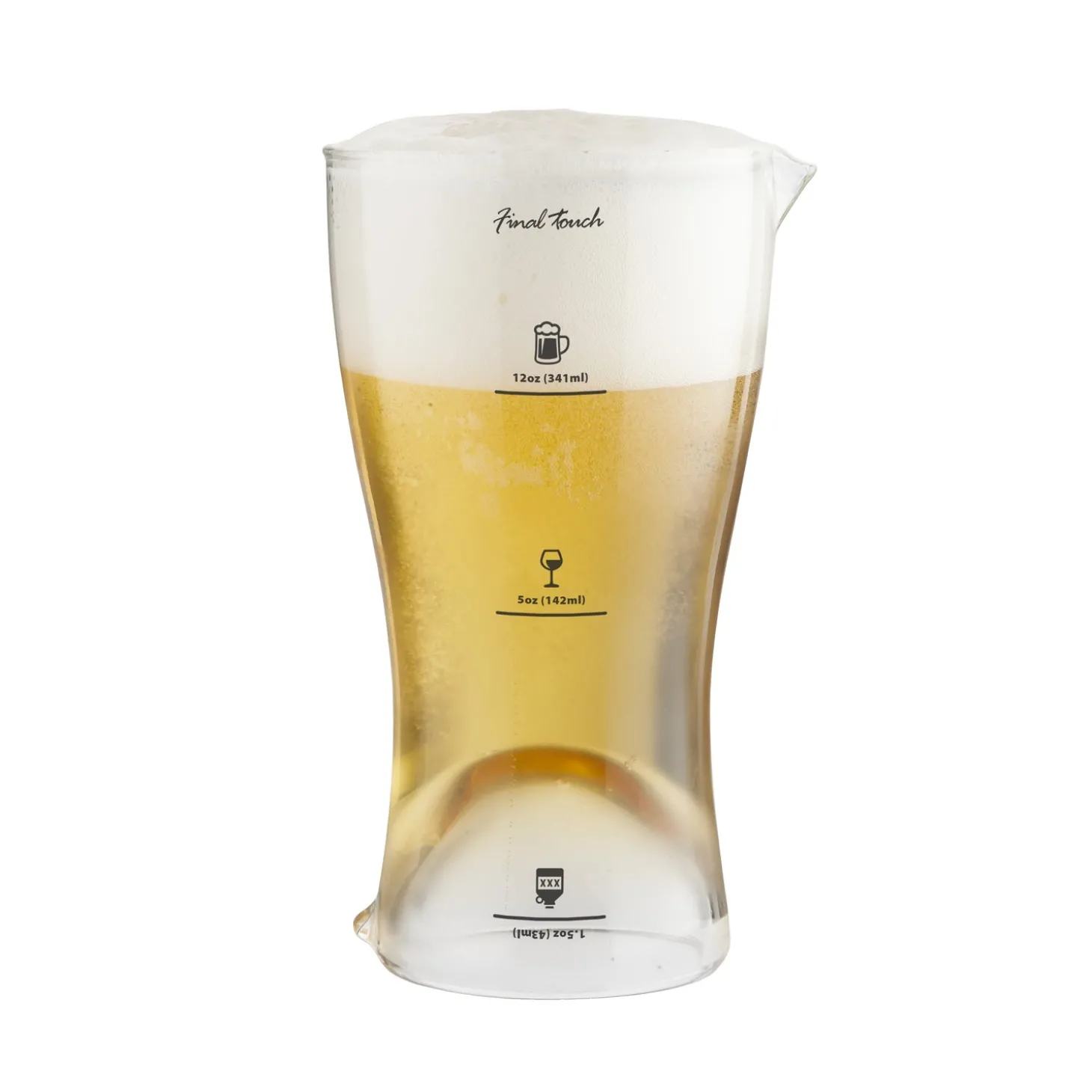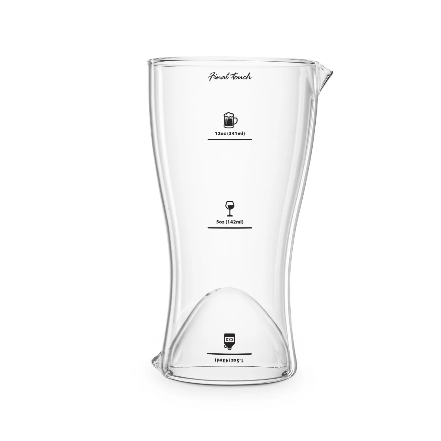 Pour equally measured drinks every time! 3 standard measuring sizes for beer, wine & liquor Place the glass upright to measure wine & beer or flip over to measure liquor for on the rocks or cocktails Spouts on each end provide easy pouring without messy drips “